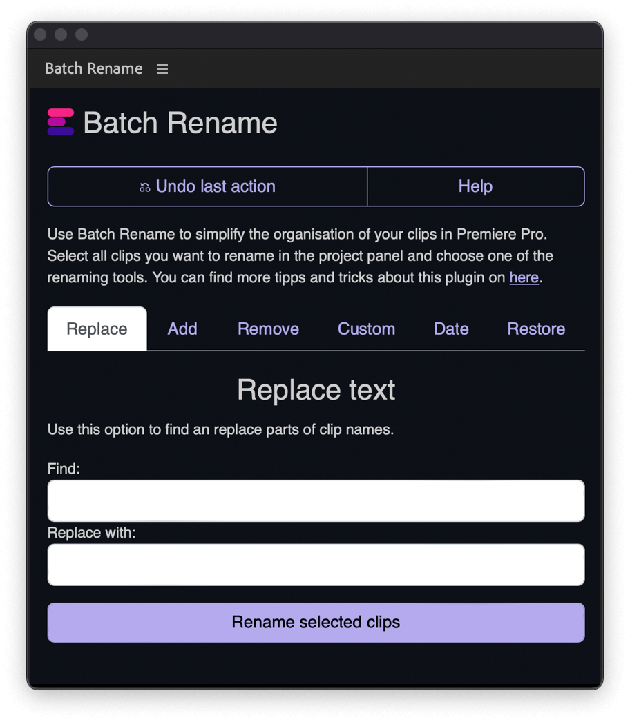 Plugin "Batch Rename" tersedia untuk Adobe Premiere Pro dan memudahkan Anda menyusun klip dan sumber dalam proyek Anda. Pilih klip Anda dan pakai plugin ini untuk mengganti nama klip secara batch lebih cepat. Ganti kata-kata dalam file sumber Anda atau tambahkan tanggal dan teks khusus ke nama klip Anda. Plugin ini menawarkan lebih banyak opsi untuk mengoptimalkan produksi Premiere Pro yang besar. Dioptimalkan untuk kebutuhan asisten editor.