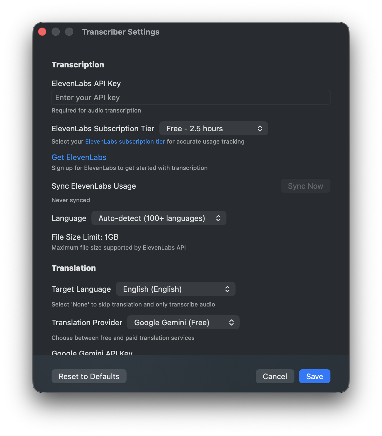 TT requires macOS 13+. There is a 1GB file limit for ElevenLabs uploads (use MP3s for very long files). If a translation fails, you can simply retry the specific SRT without re-transcribing.